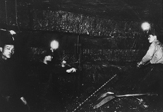 Japanese miners wearing fish oil lamps on their hats work a seam in a mine in Cumberland, B.C. |